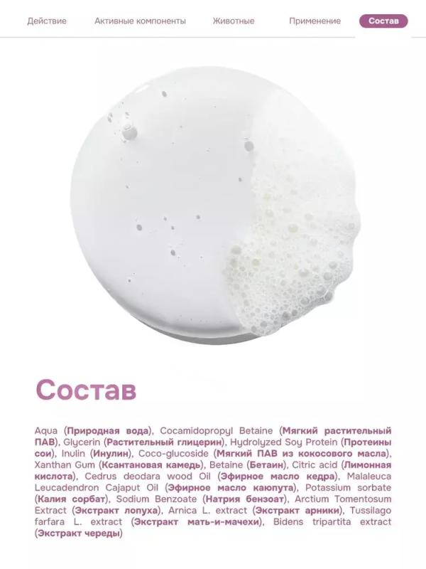 Средство обеспечивает бережное и деликатное очищение за счет системы из мягких растительных ПАВ и высококонцентрированных экстрактов в составе. Можно использовать в качестве шампуня и в качестве геля для душа.