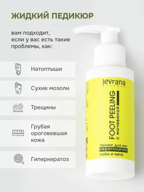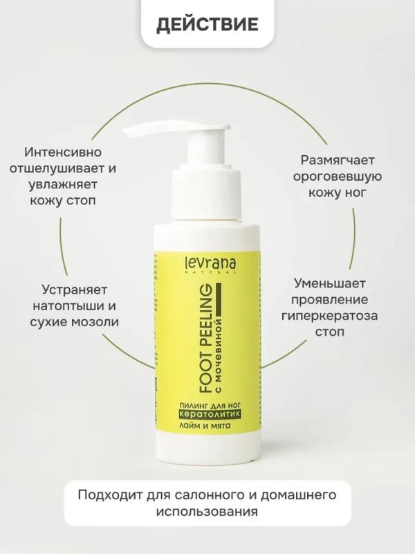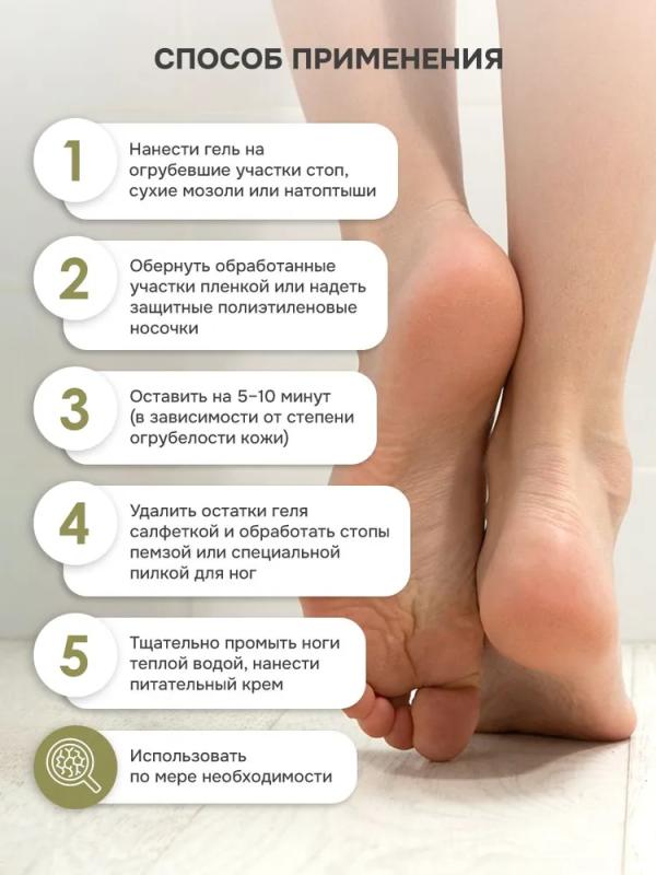 Эффективное средство для экспресс-педикюра. Гель-пилинг с высокой концентрацией мочевины размягчает ороговевшую кожу ног, устраняет натоптыши и сухие мозоли, уменьшает проявление гиперкератоза стоп.