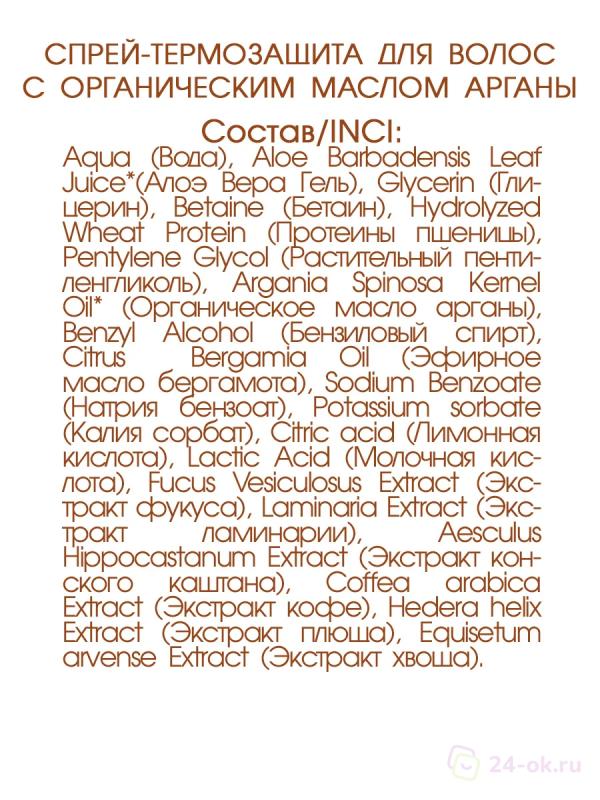 Состав: Aqua (родниковая вода), Aloe Barbadensis Leaf Juice* (сок алоэ вера органический), Hydrogenated Starch Hydrolysate (сорбитол растительный), Lactobacillus/Rye Flour Ferment* (ферменты ржи органические), Benzyl Alcohol (спирт бензиловый), Citric Acid (кислота лимонная), Aesculus Hippocastanum L. Extract (каштана конского экстракт), Hypericum Perforatum L. Extract (зверобоя экстракт), Lavandula Angustifolia Oil (масло эфирное лаванды), Magnolia Officinalis Bark Extract (магнолии экстракт), Inonotus Obliquus Pilat.f. Sterilis. Extract (чаги экстракт), Sphagnum Extract (сфагнума экстракт), Zingiber Officinale Oil (масло эфирное имбиря).