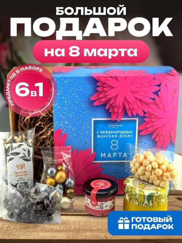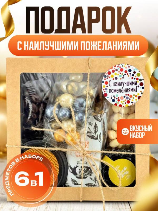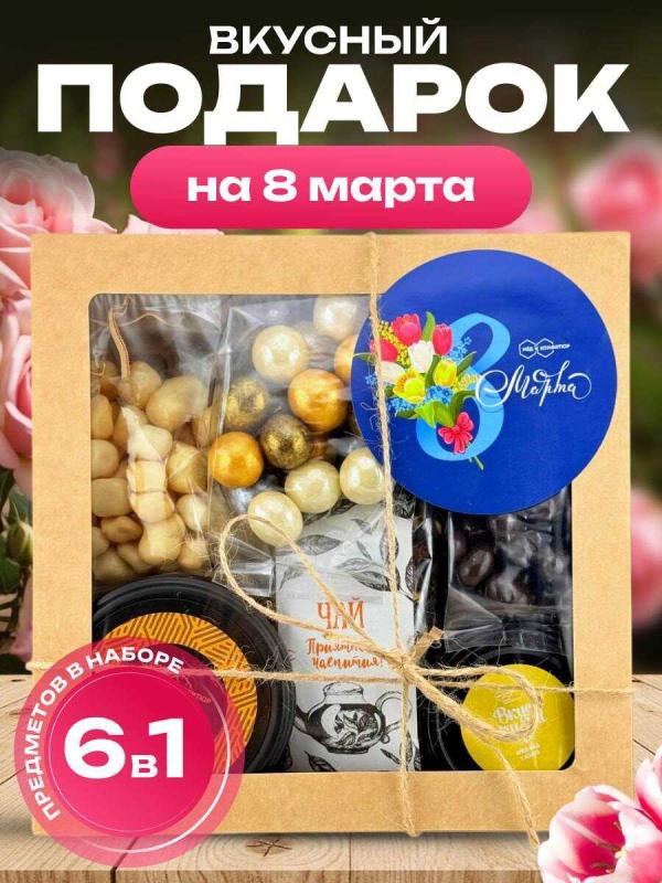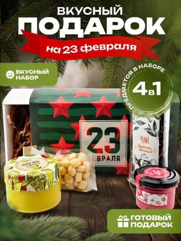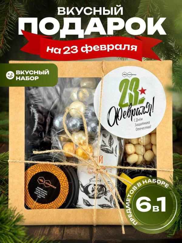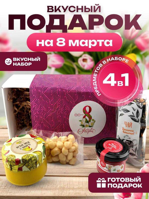 В состав набора входит: Подарочная коробка -1 шт. Крем-мёд с манго Вкус Жизни New 110 гр. -1 шт. Ассорти: грецкий орех, миндаль в меду 260 гр. - 1 шт Манго в белой шоколадной глазури 100 гр. -1шт. Чай земляника со сливками 50 гр - шт Драже праздничное фундук ассорти-100 гр Арахис в темной шоколадной глазури 100 гр-1 шт