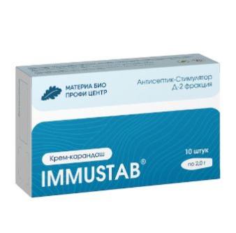 Крем-карандаш «IMMUSTAB» Антисептик-Стимулятор Д-2 фракция ‒ фитопродукт природного происхождения. Крем-карандашспособствует естественному восстановлению организма, улучшает обменные и тканевые процессы, устраняет воспаления. Фитосвечи от кремового до светло-коричневого цвета. Допускается мраморность, наличие вкраплений, наличие на срезе воздушного стержня и воронкообразного углубления. Форма выпуска: 10 штук по 2,0 г. Состав: какао-масло, Антисептик-Стимулятор Д-2 фракция. Применение (для профилактики и в комплексной терапии): опухоли любой этиологии, гипертоническая болезнь, дерматит, экзема, трофические язвы, псориаз, витилиго, кольпиты, трихомониаз, половой герпес, миома матки, молочница, простатит, доброкачественная гиперплазия предстательной железы, цистит, пиелонефрит, энтерит, гастрит, глистные инвазии, вирусные и грибковые инфекции, геморрой, гнойные септические заболевания. Способ применения. Ректально или вагинально: для профилактики − по 1 крем-карандашу на ночь