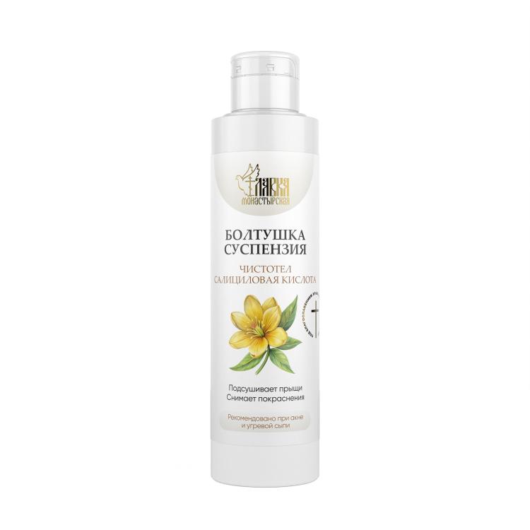 Компоненты в составе монастырской болтушки применяются в народной медицине против угревой сыпи, акне, различных кожных воспалений. Благодаря своему составу болтушка способствует глубокому очищению пор, снятию покраснений и ускорению заживления. Оксид цинка и салициловая кислота обеспечивают эффективное подсушивающее и антисептическое воздействие, помогают абсорбировать излишки кожного жира. Комплекс растительных экстрактов и масел в составе болтушки обладает антибактериальным свойством, создает защитный барьер и предотвращает появление новых воспалений. Состав: вода очищенная, экстракты календулы, прополиса, шалфея, чабреца, спирт изопропиловый, растительный глицерин, крахмал, тальк медицинский, оксид цинка, салициловая кислота, вытяжка целебной тамбуканской грязи, масла чайного дерева, эвкалиптовое, облепиховое, виноградной косточки, ароматическая композиция эфирных масел. Способ применения: перед применением встряхнуть! Наносить ватным диском на проблемные участки кожи 2-3 раза в день.