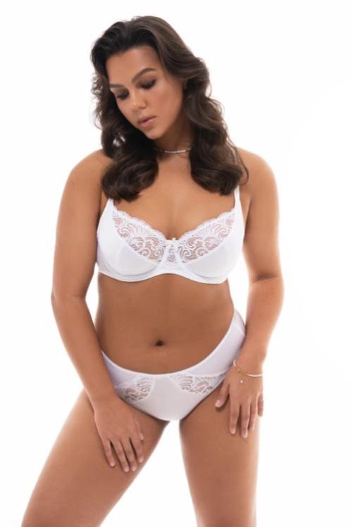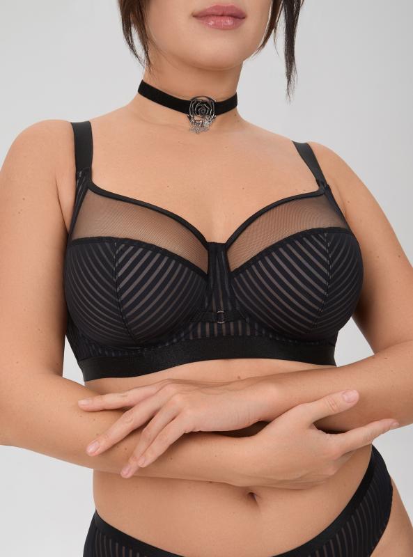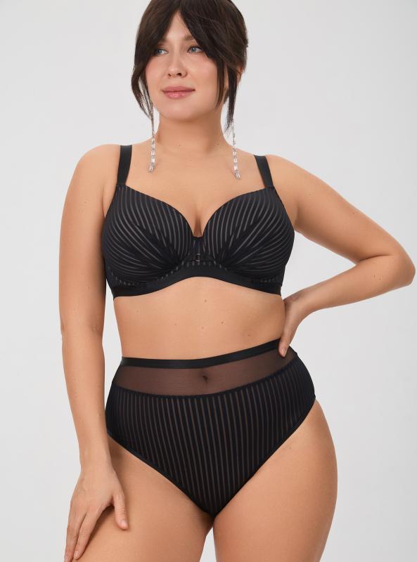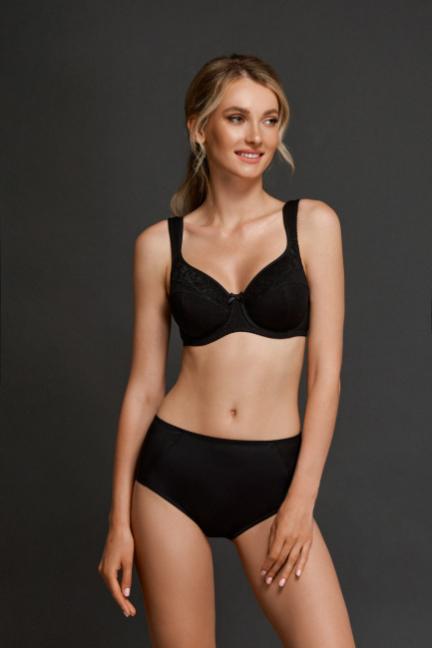 с мягкой чашкой с боковой корректирующей деталью. Верхняя деталь выполнена из эластичного кружева на подкладке из неэластичного сетчатого полотна, нижняя и боковая корректирующая детали из функционального трикотажного полотна ламинированного хлопком. Ластовица из неэластичного Швы максимально плоско расстрочены. Стан выполнен из эластичного трикотажного полотна.