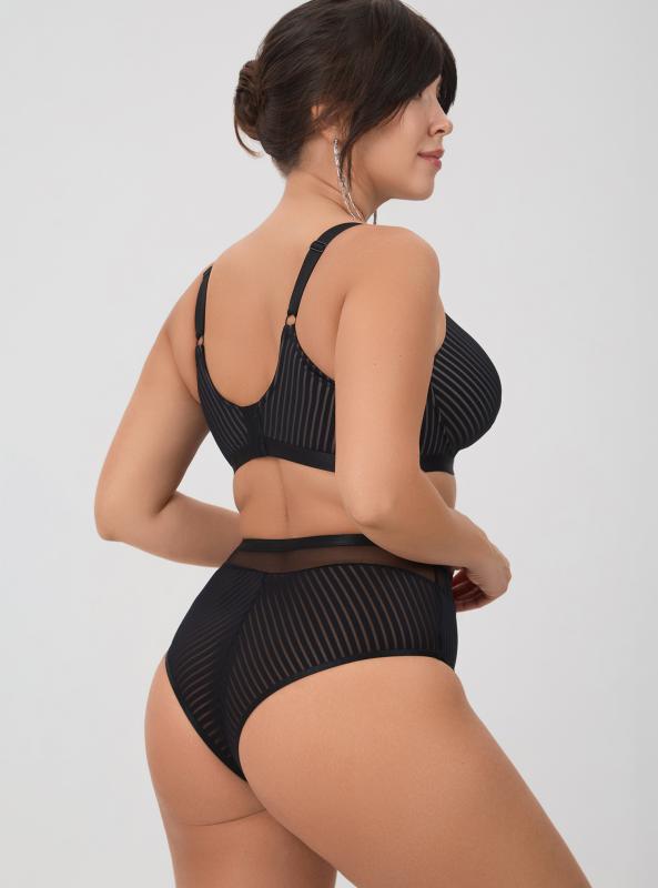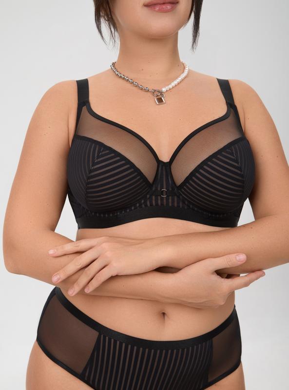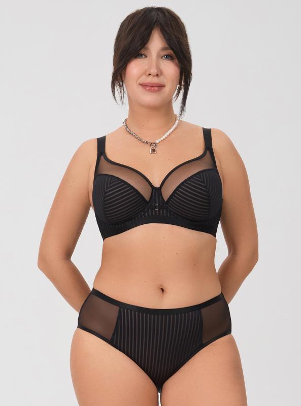 Мягкая чашка с тройным диагональным членением. Нижние детали чашки ламинированы хлопковым полотном. Вехние детали чашки декорированы геометричным кружевом в полоску на эластичной сетчатой фнукциональной подкладке. Ластовица прозрачная выполнена из неэластичного сетчатого полотна. Модель декорирована лаконичным металлическим украшением. Боковые детали стана выполнены из эластичного трикотажного полотна. Стан маечного типа.