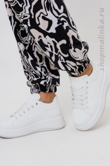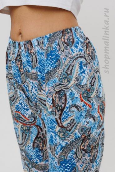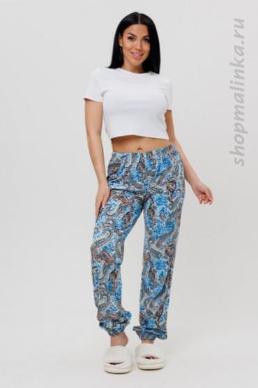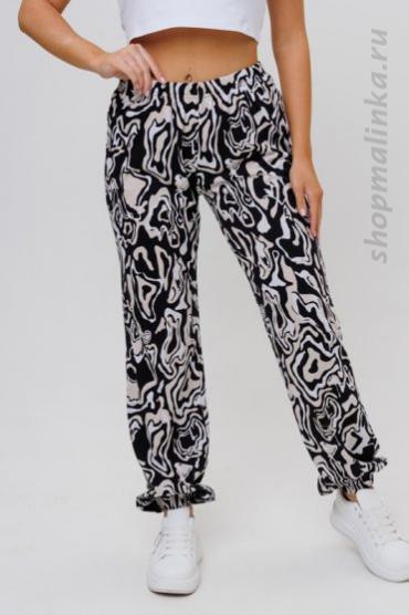 Брюки женские из трикотажного полотна, прямые, полуприлегающего силуэта, на манжетах, с боковыми карманами, пояс на широкой резинке. Принт по всему полотну.
