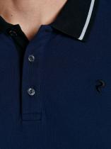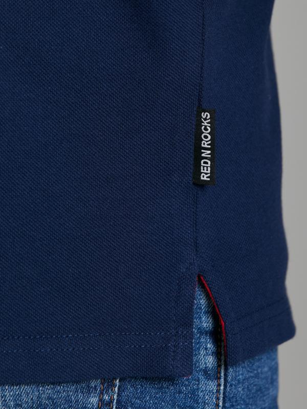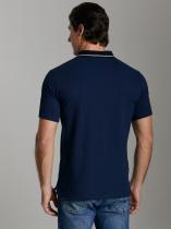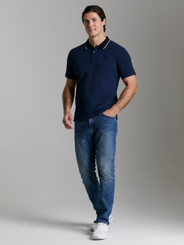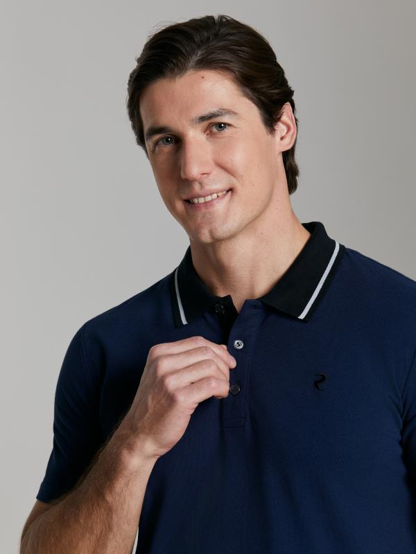 . Классическая модель поло с короткими рукавами. Воротник и манжеты рукава выполнены из трикотажной рибаны темно-синего цвета с белой полосой. На полочке застежка-планка на пуговицах. На полочке вышивка "
