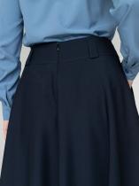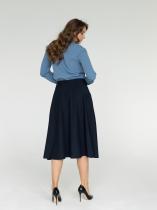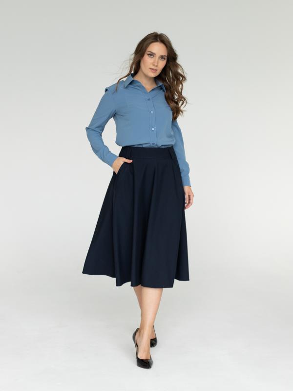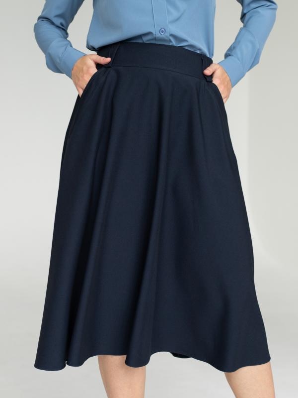 Женская юбка, расклешенная от пояса к низу на широкой кокетке с карманами по бокам. Застежка расположена сзади по среднему шву на потайную тесьму молнию. По поясу закреплены широкие шлевки.