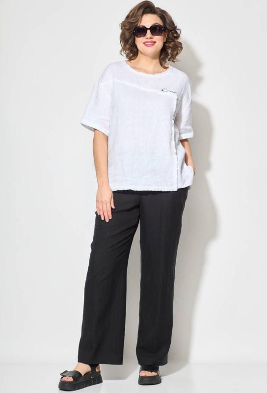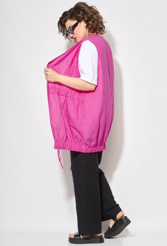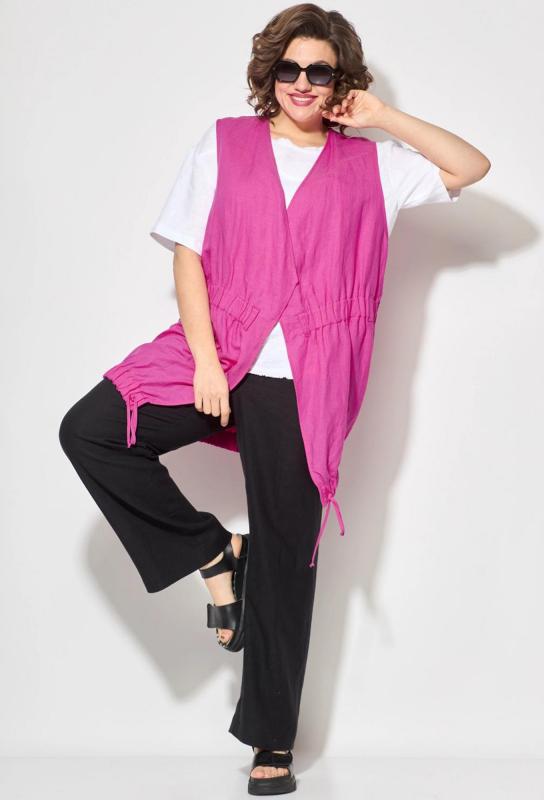 Стильный льняной комплект состоит из 3 предметов. Жилет прямого силуэта удлиненный без фиксированной застежки. Борт спадает фалдами. По талии и по низу кулиска с резинками и шнурками. Блузка прямого кроя со спущенным плечом и коротким рукавом. Круглая горловина. По переду отрезная деталь фигурной формы отделана тесьмой с открытым срезом. Низ прямой с разрезами в боковых швах. Брюки — частично на резинке пояс прямого силуэта. Карман косой в боковых швах.. Длина в 58р: жилет - 86см, брюки- 108см, блуза - 65см.. .