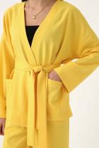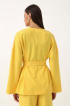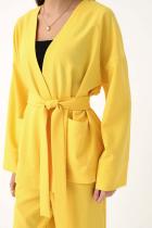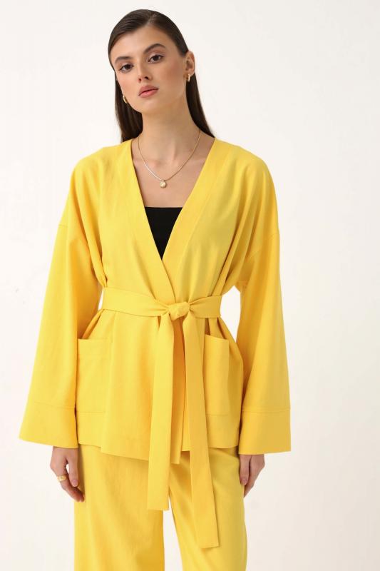 Жакет-кимоно из смесового льна. Модель прямого силуэта со спущенным плечом на поясе. По переду запах. Рукав длинный с декоративной притачной манжетой. Накладные карманы. Пояс в комплекте.