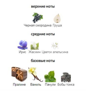 верхние ноты Черная смородина Груша средние ноты Ирис Жасмин Цветок апельсина базовые ноты Пралине Ваниль Пачули Бобы тонка