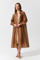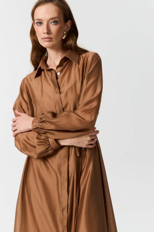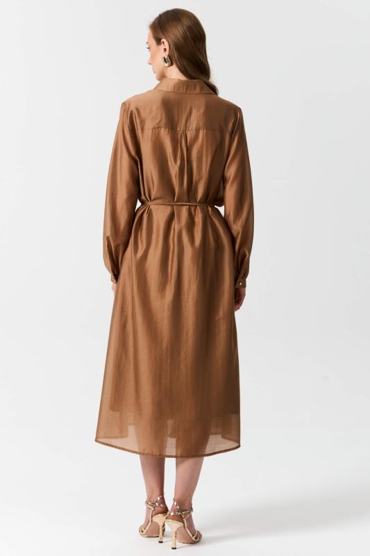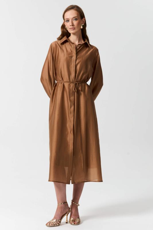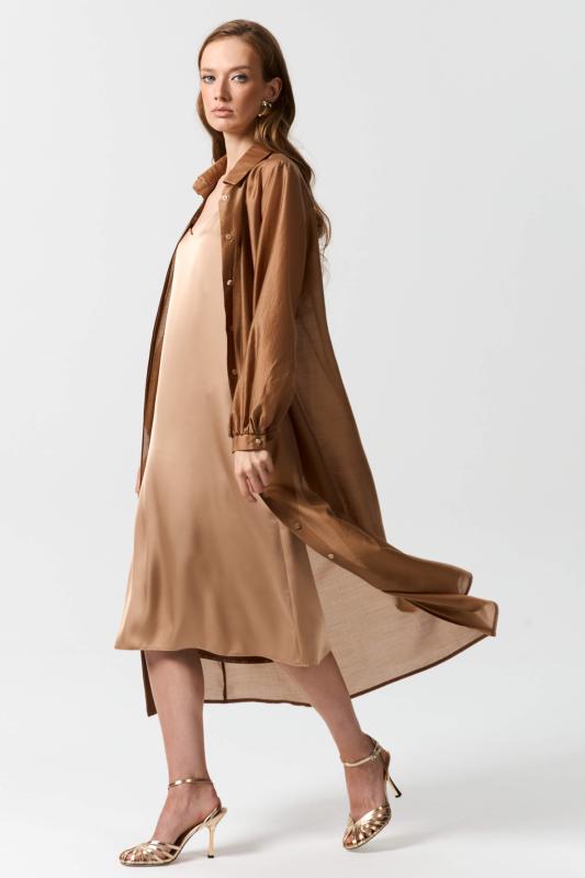 Двойное платье из воздушной вискозы. Модель состоит из нижнего слоя - платье комбинация из атласа и верхнего слоя - платья-рубашки из воздушного тенселя А-силуэта. По переду потайная застежка с акцентной пуговицей на стойке. В комплекте тонкий пояс из основной ткани.