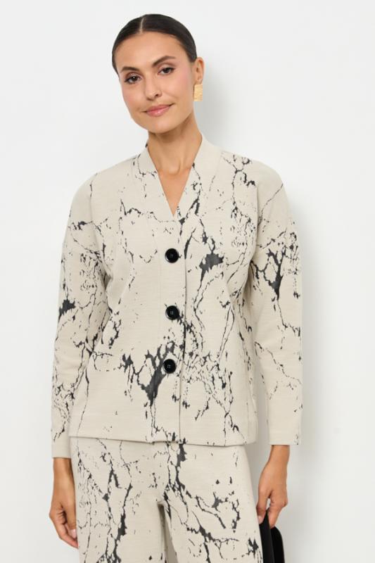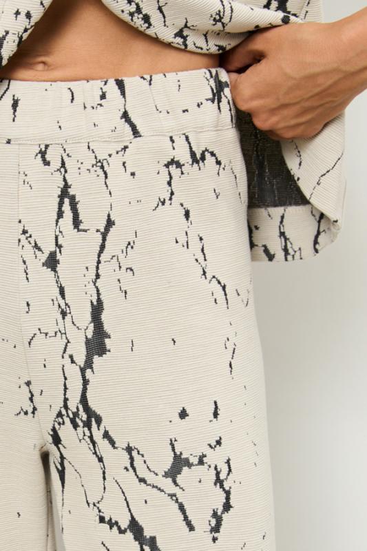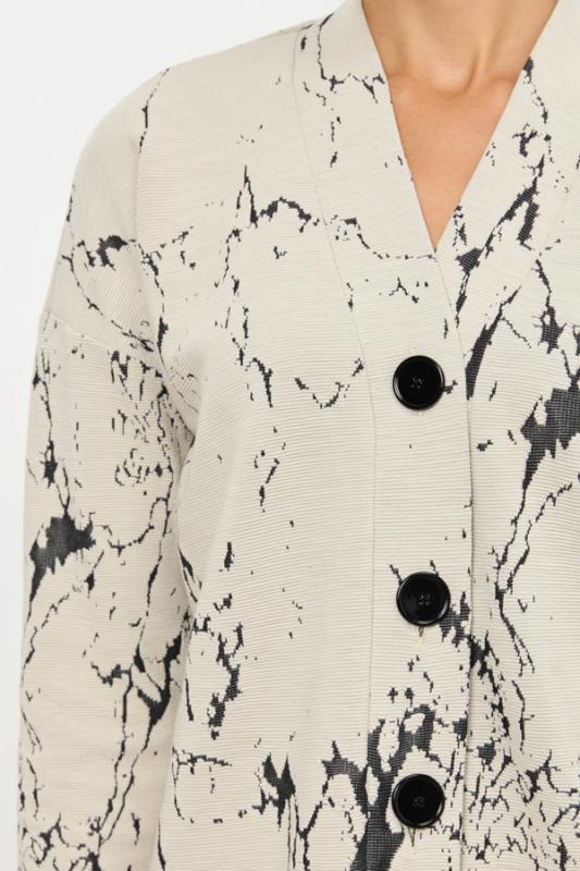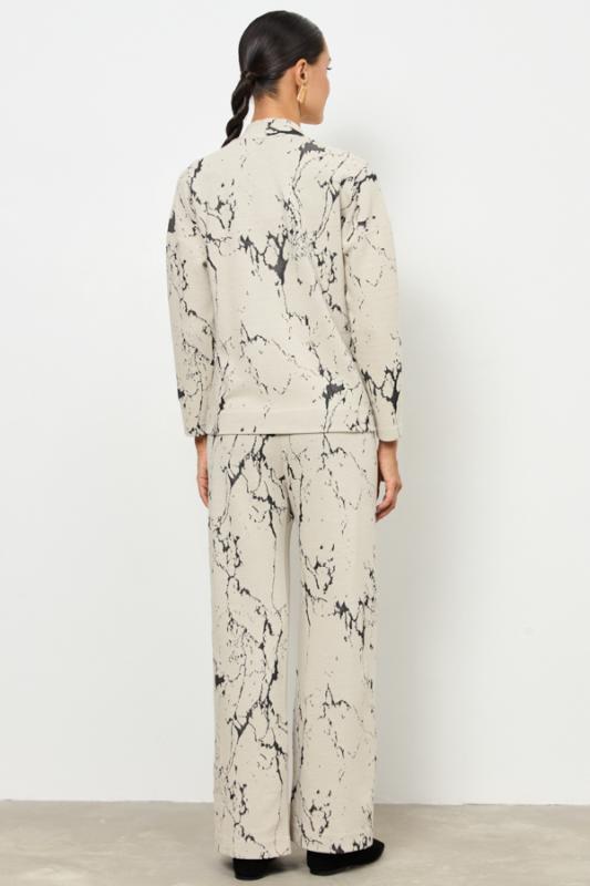 Костюм выполнен из фактурного эластичного полотна. Брюки прямого силуэта. Пояс притачной с эластичной резиной. Кардиган свободного силуэта с притачной планкой и застёжкой на пуговицы. Втачной длинный рукав в спущенную пройму.