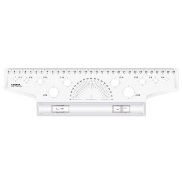 Рейсшина 30 см СТАММ предназначена для выполнения чертёжных и измерительных работ. Линейка-рейсшина оборудована металлическим роликом, и идеально подходит для нанесения ровных параллельных линий. Длина шкалы – 30 см. Благодаря специальному покрытию ролика линейка не проскальзывает по бумаге. На изделии предусмотрен транспортир 180° и 10 трафаретов окружностей. Изготовлена из качественного полистирола. Рейсшина упакована в картонную коробку с европодвесом. Цвет изделия - прозрачный бесцветный.